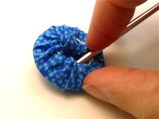 Cho 1 ít bông vào trong lòng chiếc cúc tạo độ tròn đều cho cúc áo, dồn hết phần đầu vải vào trong.