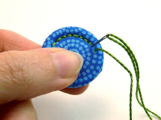 Bước 6: Lật mặt dưới của cúc lại và đặt hình tròn cắt ở bước 1 lên và khâu cố định mép che khuyết điểm phần vải thừa.